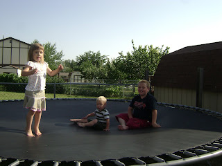 Monday Grandma, Chantel and the kids came down to visit and, play we had tons of fun!! I was so excited to have family down for the day! We cut their hair, played on the trampoline, played on the swing set and the kids had fun getting each other wet, (Nathaniel wasn't to happy, but he finally got over it!)